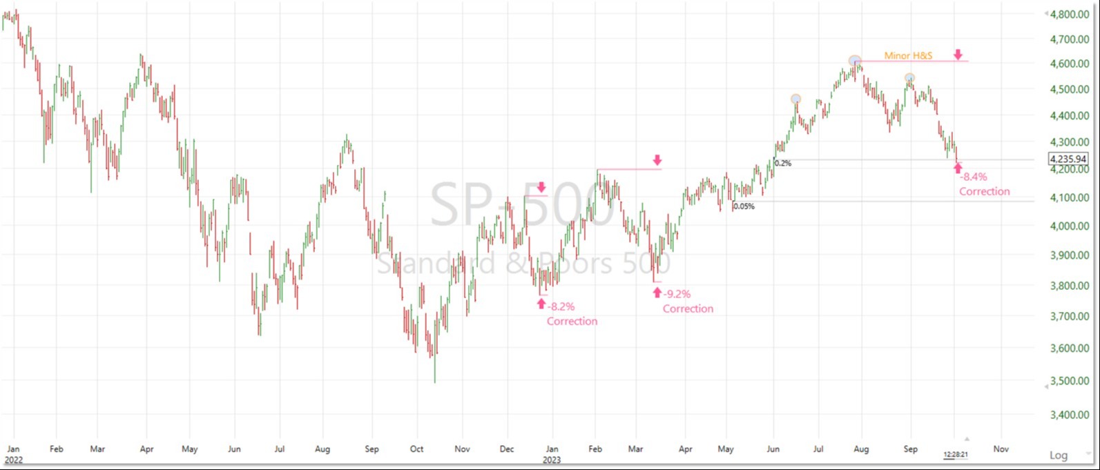 Chart 1 – a “normal” -8.4% correction (as of publishing this note intraday on October 2nd) similar to two previous corrections since the October, 2022 low: