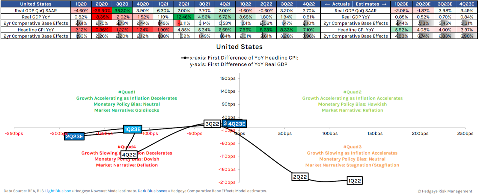 - The rate of change in GDP, year over year (Y/Y), remains a key component to understanding where we are in cycle terms. To that end, one of our primary research partners, Hedgeye, forecasts two consecutive sluggish quarters to start 2023 in the United States.